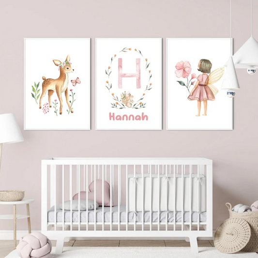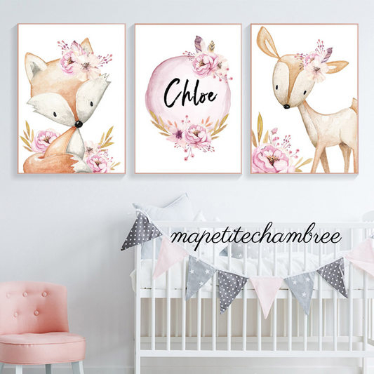 Décoration chambre bébé animaux de la forêt Lettre Doré - lot de 3 Affiches murales personnalisées