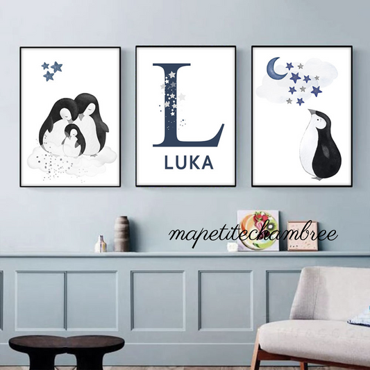 Affiches déco chambre de bébé garçon Pingouin bleu - Lot de 3 affiches - Chambre de Bébé et enfant