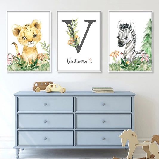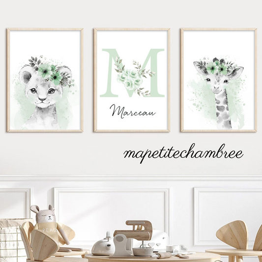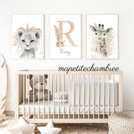 Affiches murales bébé lion girafe - Décoration Chambre Bébé Jungle Savane – Lot de 3 affiches