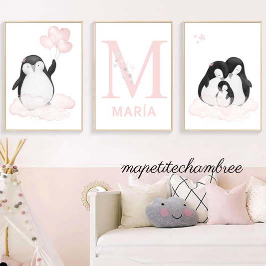 Affiches déco chambre de bébé fille Pingouin Rose - Lot de 3 affiches - Chambre de Bébé et enfant