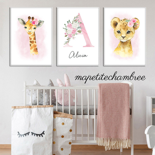 Affiches murales déco chambre bébé fille lion elephant- Décoration Chambre de Bébé et enfant - Lot de 3 affiches